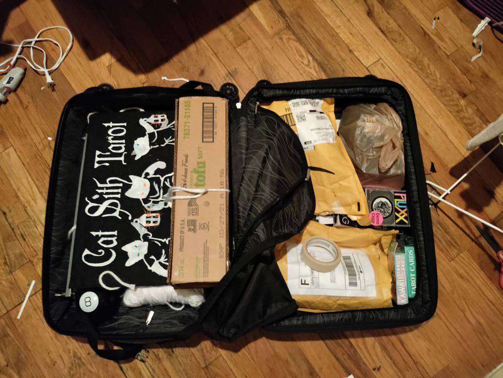 Bag's all packed for Elitch Gardens' Witchfest! They fumigated the apartment the morning of so we had to have everything already packed- including the entire kitchen. Two days before I packed our "witch kit" and left it overnight at work so we had room to pack away the kitchen. The event was slow, we didn't make much money. Family events are not ideal for tarot readers.